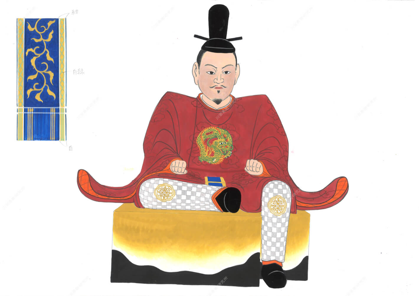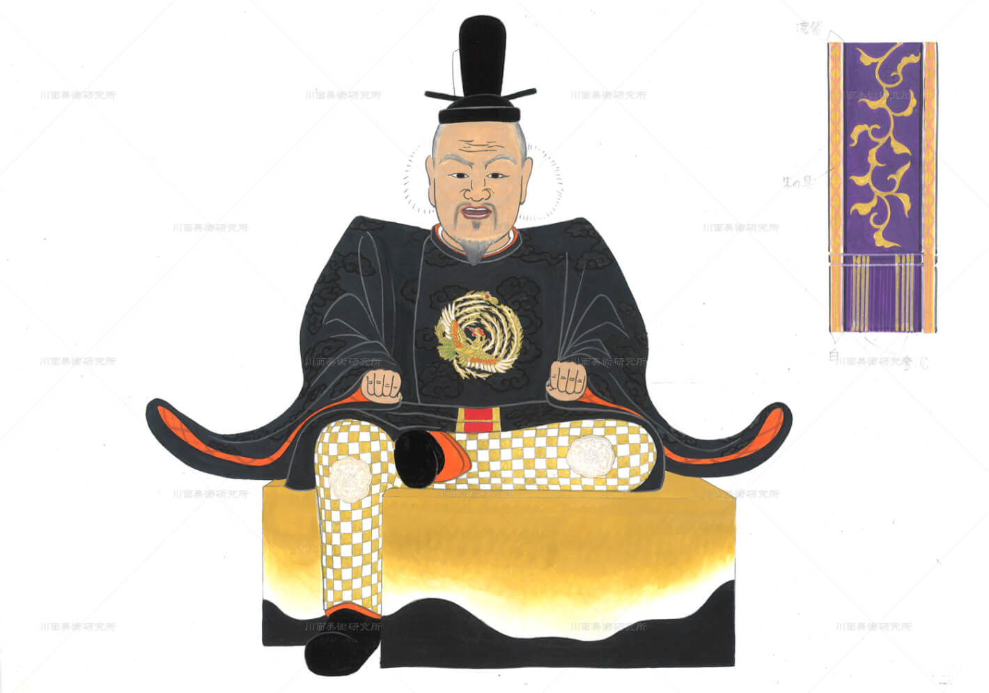 随身像彩色修理では、絵具の掻き落としの際、現状と異なる彩色層があることが分かり、類例も参考に、袍の色など変更する部分と紋など現状を踏襲する部分を検討し、宮司様の御指導の下、彩色修理に先立ち彩色復原見取図を作製しました。