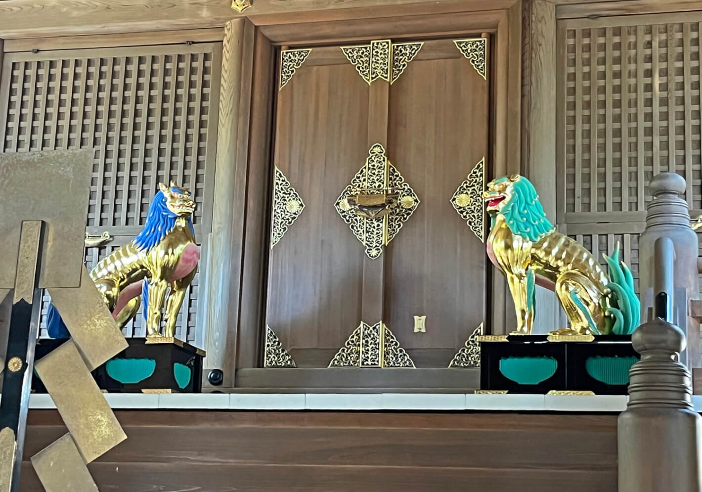 この度、令和6年に迎えられた「神宮號宣下七拾年」記念事業として拝殿屋根の葺きき替え等境内の大規模な工事が行われ、その一環として、当社では獅子狛犬と随身像の彩色修理をさせていただきました。