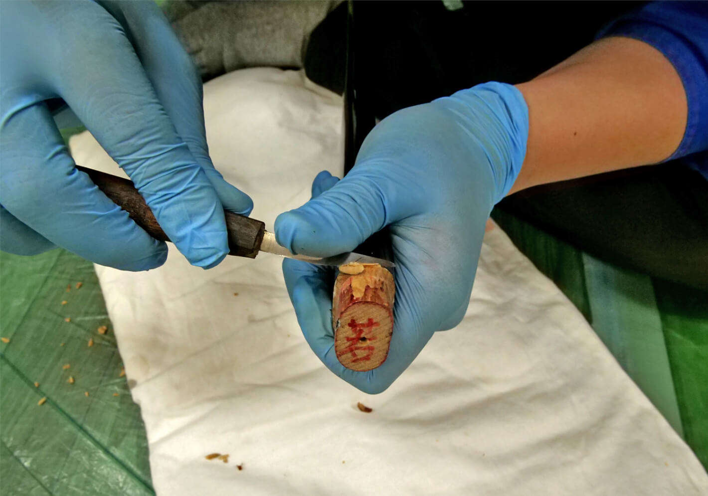 獅子狛犬彩色修理では、まず虫蝕が著しい部分についてできるだけ既存の木材を残しながら漆刻苧(麦漆に木粉を混ぜたもの)を充填して成形し、欠損部分については補作や埋め木を行い、接着面の大きさや強度によって竹釘や竹ダボ、真鍮釘、銅釘、銅鎹を使用して固定しました。