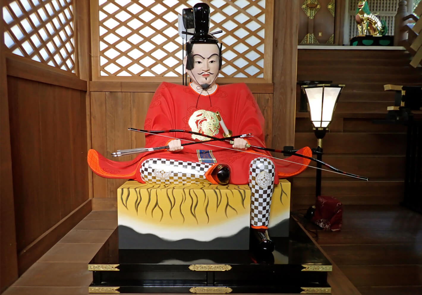 この度、令和6年に迎えられた「神宮號宣下七拾年」記念事業として拝殿屋根の葺きき替え等境内の大規模な工事が行われ、その一環として、当社では獅子狛犬と随身像の彩色修理をさせていただきました。